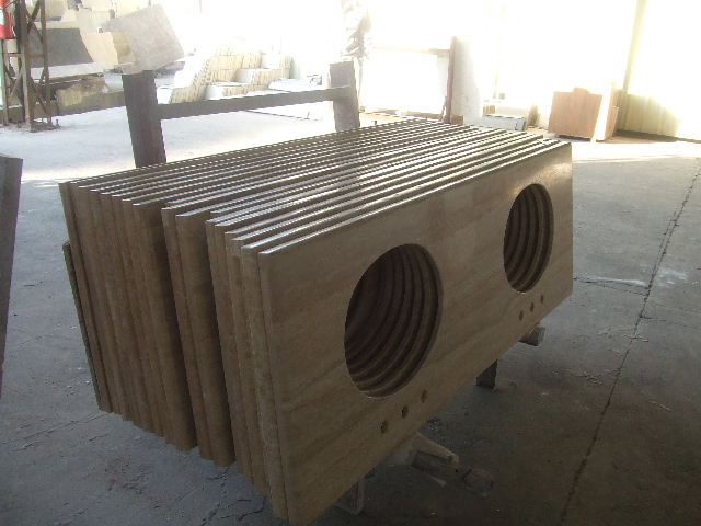 Beige Travertine vanity top is a kind of elegance top. They are widely used in both residential and commercial projects. Pencial round top edge and double bowls, 8’’ spread faucet drilling. Straight shape or other shapes,edges and sizes are available. |