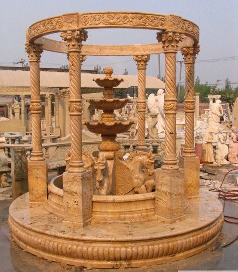 Here are our unique hand carved stone gazebos with elegance style and ornate wrought iron dome.Various materials including marble limestone travertine and sandstone, can be chosen while you want to match your garden and village yard. We will carve your favorite gazebo as your pictures and drawings. These design gazebos with their natural appearance are very well suited for parks and gardens.