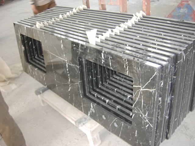 Black Marquina is a kind of natural stone imported from Spain. This kind of stone is fireproof, dampproof and rust resistant. These tops are with pencil round top edge and double rectangle bowls. It’s straight shape vanity tops. Corner shape or curved shape or other shapes, edges and sizes are available. |