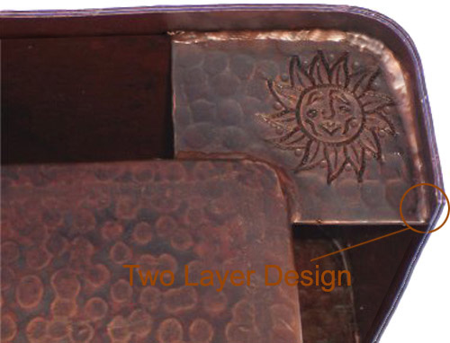 The copper farmhouse sinks are made in pure copper, Body thickness are 15 gauge(1.5mm), Front switch plate are 20gauge(1.0mm), But the exposed edge in two layer design. So it look like 10 gauge(2.0mm).