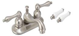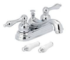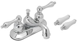 NSF Certified 4" two handle lavatory faucet, metal lever handle, with extra porcelain lever handle, brass ceramic disc valve, brass pop-up, chrome finish. |
